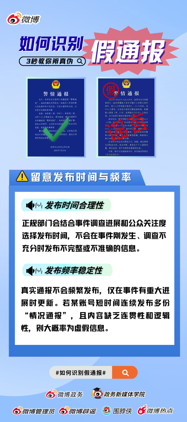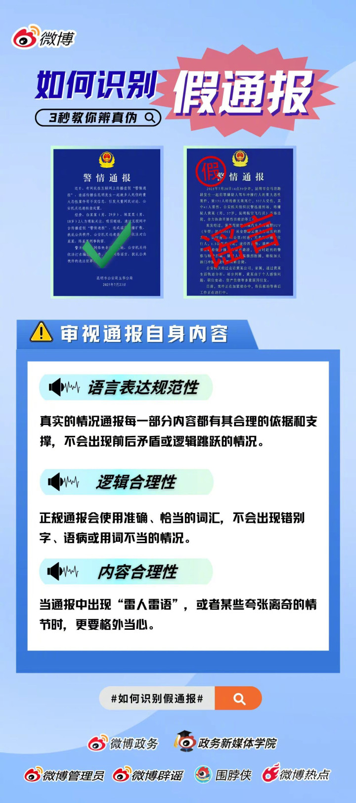 “警情通报”是公安机关权威信息发布的重要载体,“蓝底白字”代表着官方信息的公信力。但在近期的多个和社会热点事件中,有别有用心之人通过发布虚假“警情通报”,炮制恶性网络谣言,捏造耸人听闻的细节,误导公众认知。这不仅消费了网民情绪,更损害了政府公信力,甚至引发公众恐慌,严重扰乱社会秩序。